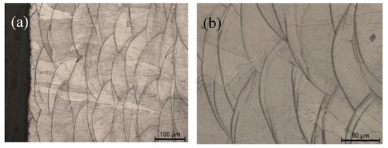Figure 4 shows the transversal section of the specimen produced by means of additive manufacturing. The micrographs show the melting pools where the pool boundaries form circular arcs due to the energy distribution during laser melting. It can be observed that the pool boundaries are interlaced with each other and that there are no evident cavities. By looking at the microstructure, it can be observed that due to the thermal cycle the dendritic microstructure disappears and grains grow by crossing pool boundaries. The cross-sections of the samples show that the stainless-steel powder particles are completely fused together. Moreover, the laser tracks overlap so that each melting pool is bonded on the other pools surrounding it. Although the material produced by means of additive manufacturing is quite compact it is important to compare its properties with those of the rolled specimen.