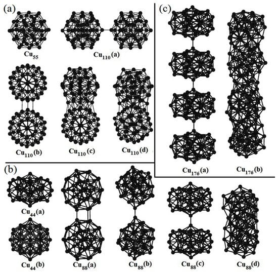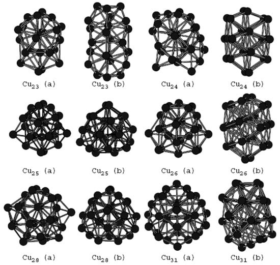 - Grigoryan, V.G.; Alamanova, D.; Springborg, M. Structure and energetics of CuN clusters with (2 ≤ N ≤ 150): An embedded-atom-method study. Phys. Rev. B 2006, 73, 115415. [Google Scholar] [CrossRef]