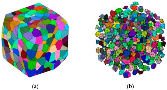 Due to the good shape of generated polyhedrons and the stability of calculation, Voronoi tessellation [45,46] is an effective method to generate the aggregates in 2/3D condition, and it has been applied in some numerical studies [14,38]. The Voronoi tessellation can generate seamlessly connected polyhedron cells based on the predefined seeds, and normally one seed can only generates one polyhedron, which provides a certainty for aggregate generation. In this paper, we adopt the aggregate-generating method which has been presented in our previous work [44]. The typical Voronoi polyhedrons and the generated aggregates are shown in Figure 1.