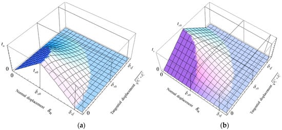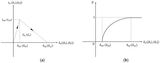 In the 3D case, one normal stress () and two orthogonal shear stresses (, ) should be given during the calculation. In this paper, we define the calculation thickness of cohesive elements as 1. Thus, the constitutive model is controlled by stresses–displacements relation [52].