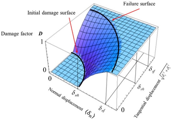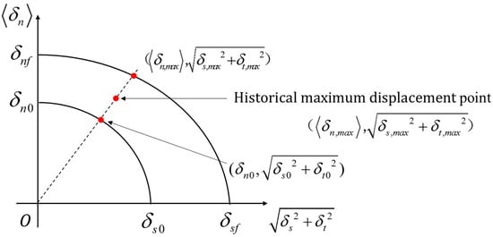 where is the initial damage displacement in normal direction, and is the initial damage displacement in tangential direction. The relation between () and () is shown in Figure 3.
