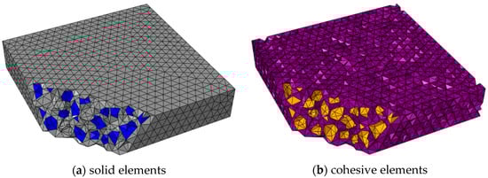 According to the algorism proposed in references [42,47,48], the cohesive elements are inserted into the mesh of two-phase mesostructure. The process of inserting cohesive elements can be divided into two steps: (1) split the continuous solid elements and renumber them (including element number and node number) and (2) insert the cohesive elements into the interfaces of those split solid elements. After inserting the cohesive elements, we can obtain a new mesostructure with five different elements. These five different elements (Figure 2) are: (1) solid elements for aggregates, namely SOL_AGG; (2) solid elements for mortar, namely SOL_MOR; (3) cohesive elements for ITZ, namely CE_ITZ; (4) cohesive elements for the potential fracture surfaces of mortar, namely CE_MOR; (5) cohesive elements for the potential fracture surfaces of aggregate, namely CE_AGG.