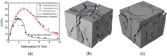 The mechanical and fracture behaviors of the concrete standard specimen [44]: (a) stress–strain curve, (b) the fracture pattern of concrete with low boundary constraint, (c) the fracture pattern of concrete with high boundary constraint (the deformation is magnified five times).
