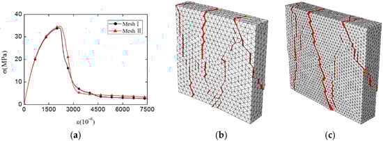 The simulation results of Mesh I and Mesh II are shown in Figure 11, including stress–strain curve and fracture pattern. Despite a few differences, the distribution of major cracks, the stress–strain curve, and the compression strength of two meshes are highly similar. Considering the balance of accuracy and efficiency, the element size of Mesh I was finally chosen for all meshes in the following simulations.
