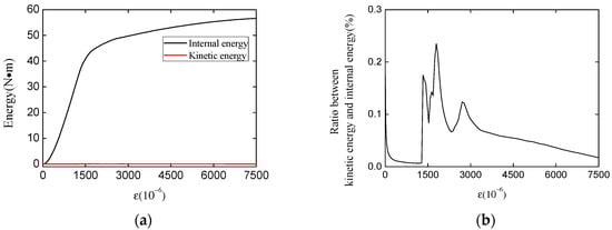 To ensure the quasi-static loading condition, the smooth step [52] is chosen, and the loading time is set to 1.5 s through the repeat trial. To examine whether the model meets the quasi-static loading condition, we extracted the kinetic energy and internal energy (the energy generated by deformation of the specimen) of a typical specimen under uniaxial compression condition. The evolution of kinetic energy and the internal energy during the loading process is shown in Figure 12. It can be seen that during the whole loading process, the ratio between kinetic energy and internal energy always keeps a very low value (under 0.3%). The results above show that the kinetic energy has little effect on the simulation results in this paper, which means that the numerical model in this paper meets the quasi-static loading condition.