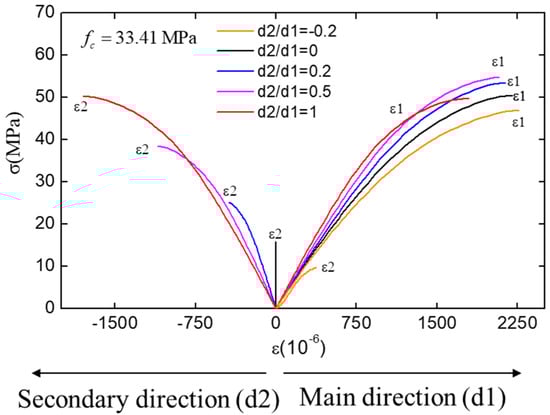 The stress–strain curves of concrete under different biaxial compression conditions are shown in Figure 13. It can be seen that the relative strength of concrete under biaxial compression is much higher than the one under uniaxial compression in general, and the slope of curve in main direction (d1) increases with the increase of secondary-direction loading (d2). This phenomenon is caused by the restraint effect in secondary direction. Due to the restraint of the secondary direction, the concrete cannot deform freely in the plane formed by two loading direction.