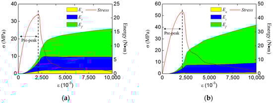 Energy increment proportions of concrete specimen with different inner friction coefficient: (a) f = 0.3; (b) f = 0.15.