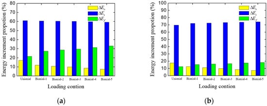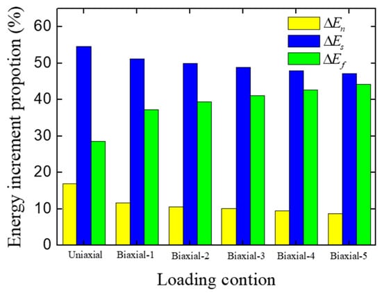 To analyze the effect of the biaxial-loading ratio on the concrete fracture mode in terms of energy, we extracted the energy increments at the pre-peak stage, and these are listed in Table 4. The proportion of different kinds of energy increment are also shown in Figure 16. With the increase of biaxial-loading ratio, the proportion of friction stress work increases, meanwhile the normal stress work and shear stress work decrease. This is because of the increase of constraint on the loading surfaces, and the boundary constraint makes the concrete specimen separate more hardly. For this reason, more cracks are closed and subjected to the compression stress. When the cracks slip, more friction work is generated.