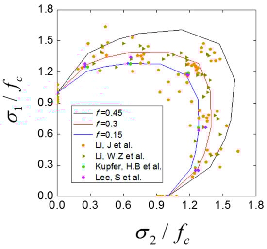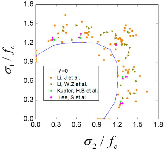 - Kupfer, H.B.; Gerstle, K.H. Behavior of Concrete Under Biaxial Stresses. J. Eng. Mech. Div. 1973, 99, 853–866. [Google Scholar]
