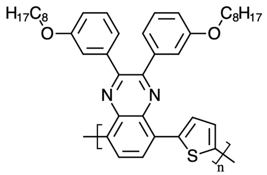 The donor polymer, poly[2,3-bis-(3-octyloxyphenyl) quinoxaline-5,8-diyl-alt-thiophene-2,5-diyl], Figure 1 (TQ1), was purchased from Lumtec, with a number averaged molecular weight, Mn, of 31,800 and a polydispersity index (PDI) of 3.11. The acceptor polymer, poly{[N,N′-bis(2-octyldodecyl)-naphthalene-1,4,5,8-bis(dicarboximide)-2,6-diyl]-alt-5,5′-(2,2′-bithiophene)}, Figure 2 (N2200 or P[NDI2OD-T2]), was purchased from Ossila, with an Mn of 150,500 and a PDI of 1.9. The solvents used are summarized in Table 1. The solvents were chosen to be less hazardous to environment and health, as compared to the solvents often used to prepare OSC. The GSK Solvent Selection Guide 2009 can be used as a good starting point in finding alternatives for the halogenated solvents [23]. This guide was used to discriminate solvents in this contribution.