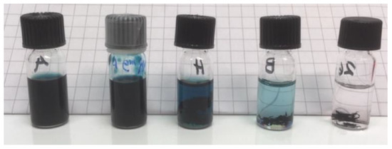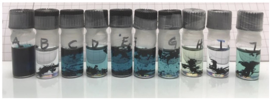 An example of the solubility tests of N2200 in the solvent blends calculated by the HSPiP program, at the initial stage of the test. The blends in the vials are (volume ratio in brackets); A: Toluene/1-methyl naphthalene (62/38), B: Cumene/benzaldehyde (72/28), C: Tetrahydronaphthalene/methyl acetate (88/12), D: Mesitylene/benzaldehyde (65/35), E: Tetrahydronaphthalene/o-xylene (65/35), F: Tetrahydronaphthalene/2-methyl tetrahydrofuran (77/23), G: Tetrahydronaphthalene/isobutyl acetate (85/15), H: Cumene/2-methyl anisole (60/40), I: Ethyl benzene/2-methyl anisole (53/47), J: Cumene/anisole (72/28).