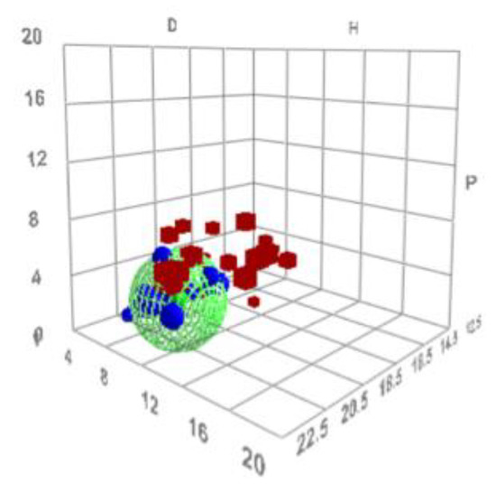 The calculations of the HSP values for N2200 resulted in δD = 18.4, δP = 0.7, δH = 2.3, and R0 = 3.9, and core values of ±[0.15, 0.50, 0.35]. From these values, it is possible to present the solubility of N2200 as a sphere in Hansen space, as seen in Figure 4.