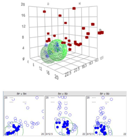 - Agata, Y.; Yamamoto, H. Determination of Hansen solubility parameters of ionic liquids using double-sphere type of Hansen solubility sphere method. Chem. Phys. 2018, 513, 165–173. [Google Scholar] [CrossRef]