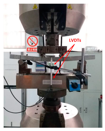 The four-point bending specimens were loaded downward at a speed of 0.2 mm/min by a 250 kN Instron testing machine. The dimension of the thin plate bending specimens was 400 × 100 × 20 mm. The loading span and support span of the test specimens were 100 mm and 300 mm, respectively. The tests used a force sensor and linear variable differential transformers (LVDTs) to collect displacement and force in the middle of the specimens. Two LVDTs were fixed on both sides of the bending specimens, as shown in Figure 4. Experiments determined the force and displacement curves, which were converted into stress-displacement curves using Equation (1).