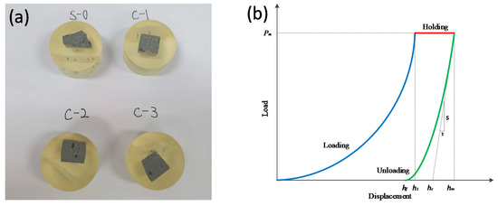 A Nano-indenter was used to investigate the micromechanical properties of hydration products and the interfacial transition zone, which mainly included elastic modulus and hardness. Small particles of the specimens having a diameter of about 1 cm were taken and cold-set with epoxy resin. The samples were sanded and polished by a sander to make the surface smooth. The prepared specimens are shown in Figure 6a. The indenter was a triangular pyramid Berkovich diamond indenter with an angle between the centerline and the cone of 65.03°. During the Nano-indentation test loading process, the holding time was 10 s, the maximum indentation load was set to 100 mN, and the loading and unloading rate was 100 mN/min. To avoid the influence of the distance between the measuring points being too close, the center distance of each measuring point was not less than 3 μm. Force and displacement curves were obtained for each group of experiments.
