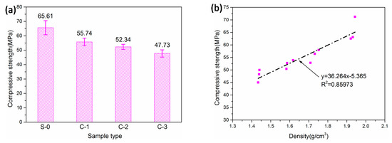 Figure 7 shows the measured 28-day compressive strengths of the LTCCs and the plots of the compressive strengths with respect to density. S-0 without cenospheres was the reference group. It can be seen that the compressive strengths of the LTCCs decrease from 58.87 MPa to 50.06 MPa with an increase in the amount of cenospheres. The result was consistent with the conclusion reported in literature [35]. This decrease could be due to an increase in the internal porosity of the LTCC accompanied by an increase in the amount of cenospheres. In addition, the bond strength between the cement paste and cenospheres was lower than the strength of the cement paste, so the increase in the amount of cenospheres could reduce the compressive strength of the LTCC.