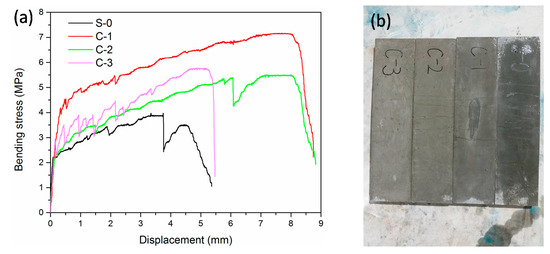 After the cement paste was loaded in the initial crack, the bridging of the fibers acted [42], so the load-displacement curve of the bending test could exhibit a certain strain hardening phenomenon. However, the bonding strength between the fibers and the cement paste in the C-3 sample was too low, which caused the fibers to be pulled out, which decreased its bending strength and bending strain capabilities.