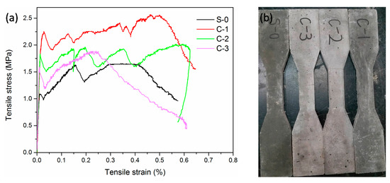 The uniaxial tensile test stress-strain curves of the LTCCs after 28-days of curing are shown in Figure 10a. The initial cracking stress, ultimate tensile stress, and ultimate tensile strain are listed in Table 4. Similar to the bending test results, the ultimate tensile strength of the LTCCs incorporating cenospheres was significantly higher than that of the reference group. This increase could be explained because the cenospheres have a pozzolanic activity-caused secondary hydration reaction with calcium hydroxide produced by cement hydration to form hydration products, so cenospheres were beneficial to the later strength growth. At the same time, the ultimate tensile strain of the LTCCs doped with 20% cenospheres was 1.525 times that of the reference group, indicating that the incorporation of an appropriate amount of cenospheres was beneficial in improving the tensile properties of the LTCC. As the amount of cenospheres increased, the adhesion between the fibers and the cement slurry decreased, so that more PVA fibers were in the pull-out state rather than being pulled off. This caused a decrease in tensile strength, which also explained the constant decrease in ultimate tensile strength as the amount of cenospheres increased, as shown in the data in Table 4. However, when the amount of cenospheres reached 30%, the tensile strain capacity was minimized. This phenomenon illustrated that when the amount of cenospheres reached a certain level, the adhesion between the fibers and the cement paste was insufficient, resulting in more fibers slipping and a poor tensile strain hardening ability. The tensile specimens only had a few cracks due to the small number of fibers, as shown in Figure 10b. From the perspective of the tensile property, this paper considered that the optimum amount of cenospheres in the LTCC was 20% of the cementitious binders.