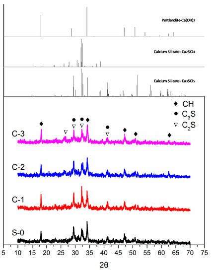 To study the effect of cenosphere content on the phase structures of the LTCCs, XRD analysis was performed. XRD results are shown in Figure 11. It was found that C3S, C2S, and Ca(OH)2 were the major components of the LTCCs. Cenosphere content did not affect the LTCC hydration product type, and only the diffraction peak intensities of the products were different. During the hydration process, the peak intensity of Ca(OH)2 (2θ = 34.2°) in the reference group without cenospheres was the highest. However, Ca(OH)2 was adsorbed on the surface of the fibers and the pores between the fibers, causing stress concentration points. The fibers became brittle, which was disadvantageous for the improvement of toughness. This reason also explained the results of the four-point bending test. A diffuse diffraction peak appeared at 25° to 33° in the XRD pattern, which could be inferred to be a C-S-H gel generated by the LTCC hydration reaction. Compared with the reference group without cenospheres, the diffraction peaks of LTCCs doped with 10% cenospheres contained a larger area, which indicated that it produced more C-S-H gels and cenospheres contributed to the LTCC hydration reaction.