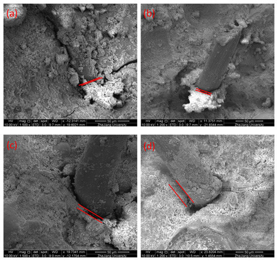 The interfacial adhesion between fiber and hardened cement paste was one of the important factors affecting the macroscopic mechanical properties of the materials [41]. To observe the adhesion of the fiber to the cement paste, SEM was performed on the fracture of the bending specimens. Figure 14 shows that the bonding strength between fiber and cement paste decreased with an increase in the amount of cenospheres. The reason for this phenomenon could be that the incorporation of cenospheres made the microstructure of the cement slurry loose, resulting in large pores at the interface between the fiber and the cement paste. Figure 13 also confirmed this point. The cement paste with weaker bonding strength would cause the fiber to slip, and proper slip is beneficial in large bending deformation. In addition, it can be seen that the fiber surface of the LTCCs was attached with less hydration product than the reference group, indicating that its bonding strength was weaker.