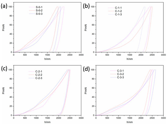 Indentation load-depth (P-h) curves of the matrix phase: (a) S-0, (b) C-1, (c) C-2, and (d) C-3.