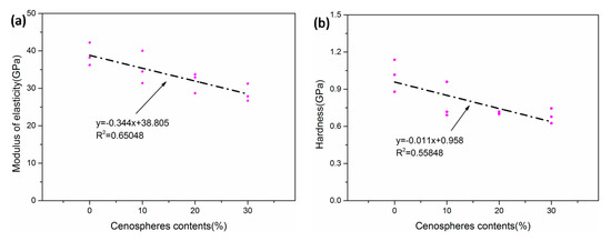 (a) Modulus of elasticity with respect to cenosphere content. (b) Hardness with respect to cenosphere content.