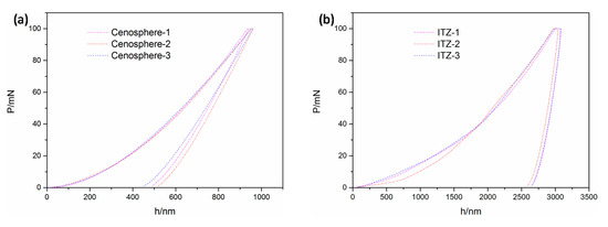 Indentation load-depth (P-h) curves of different phases: (a) cenospheres, (b) ITZ.