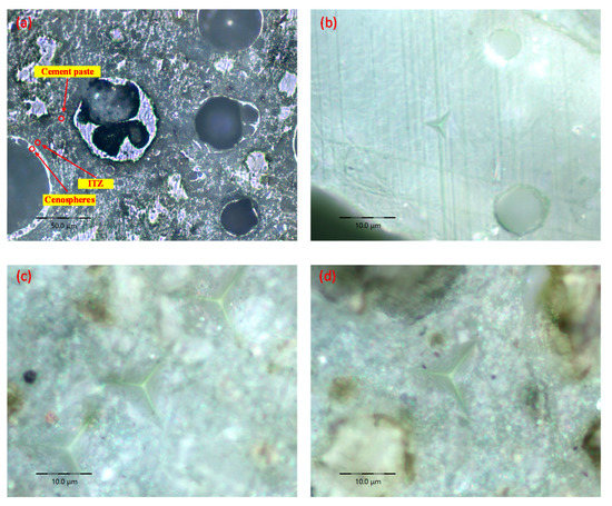Optical microscope images: (a) LTCC, (b) cenospheres, (c) ITZ, and (d) cement matrix.