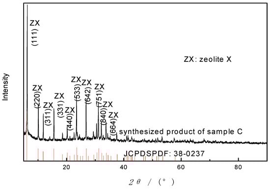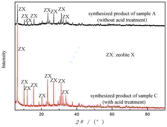 Figure 7, zeolites were generated from both sample A and C, with the same single crystalline phase (ZX). However, from the intensity of the peaks, the zeolite product of sample C has a much higher degree of crystallinity than that of sample A. The removal of Fe by acid washing may explain the improvement of crystallinity. In addition, after acid treatment, the yield increases (2.375 g vs. 1.420 g from 10 g of starting material), and the whiteness and fineness of ZX enhances, which is consistent with the prior study of CFA zeolites [