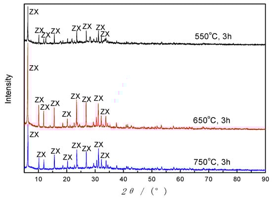 Figure 9, ZX was formed under different calcination temperatures, but with different degrees of crystallinity. When the temperature is lower than 650 °C, the peak intensity increases with the increase of calcination temperature, and then descends over 650 °C without the crystal phases changing. Furthermore, the yield increases gradually as the calcination temperature increases. Accordingly, in a specific range of temperature (550–750 °C), calcination affects the output of synthesized zeolites and its crystallinity, but not the zeolite types.