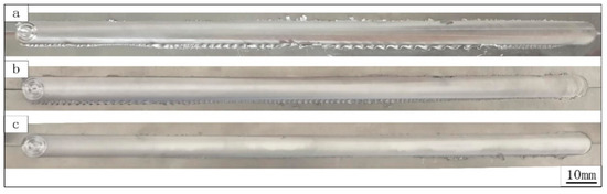 Surface appearances of the welds produced at a welding speed of (a) 100, (b) 150, and (c) 200 mm/min.