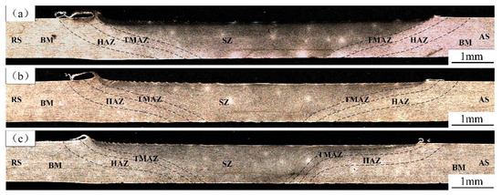 Figure 3 shows the cross-section microstructure of the welds produced by different welding speeds, where no void defects were found. Observing the microstructure, the weld cross-section could be divided into the BM, the heat affected zone (HAZ), the TMAZ and the SZ. It was found that the width of the SZ gradually decreased with increasing welding speed, which was the result of a decreasing heat input. This result is in accordance with the research reported by Huang et al. [5,15]. The SZ was “basin-shaped” at the welding speeds of 100 and 150 mm/min, while the SZ became “bowl-shaped” when the welding speed increased to 200 mm/min. However, a black line was observed at the root of the SZ, which is located at the tip of the pin. This line may be caused by an inconsistency of material flow direction between the upper and lower sides of the pin tip.