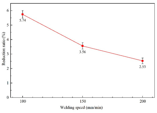 The effect of the welding speed on thickness reduction is shown in Figure 4, where the thickness reduction rate of the joints decreased with increasing welding speed. The thickness reduction rate was 5.74% (0.0528 mm) at a welding speed of 100 mm/min, and was only 2.53% (0.0233 mm) at a welding speed of 200 mm/min. With increasing welding speed, the degree of material softening decreased as the heat input reduced, where a decreased degree of material softening increases the difficulty for material flow as driven by the shoulder. Meanwhile, the number of tool rotations per unit distance decreases, which reduces the number of times that the shoulder will drive the materials at both the advancing side (AS) and the retreating side (RS). This, in turn, contributes to a gradual decrease of the thickness reduction rate of the joints with increasing welding speed.