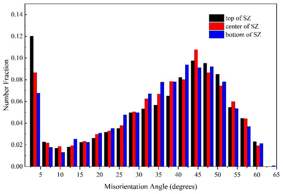 The misorientation angles of the top, centre and bottom of the SZ are shown in Figure 9, where the proportion of LAGBs in these three zones were 17.76%, 14.61%, and 12.41%, respectively. Generally, the grain is small when the dynamic recrystallization is complete, and thus the proportion of LAGBs is low. However, in this work, the proportion of LAGBs decreased gradually from the top to the bottom of the SZ, while the average grain size increased gradually. During the FSW of ultra-thin aluminium plates, the effect of the temperature gradient along the vertical direction of the SZ can be ignored owing to the good thermal conductivity and the minimal thickness of the ultra-thin aluminium plate. The grain deformation generates more dislocations and the frictional heat promotes the movement and redistribution of these dislocations, and therefore the LAGB is primarily related to the change of dislocations [18]. From the top to the bottom of the SZ, the degree of grain deformation gradually decreased, indirectly resulting in a reduction of the proportion of the LAGBs.