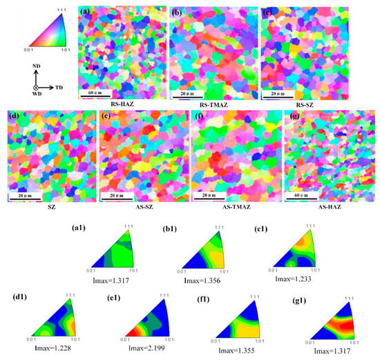 (a–g) Inverse pole figure color maps, and (a1–g1) corresponding color keys of the (a,a1) RS-HAZ, (b,b1) RS-TMAZ, (c,c1) RS-SZ, (d,d1) SZ centre, (e,e1) AS-SZ, (f,f1) AS-TMAZ, (g,g1) AS-HAZ of the weld produced at a welding speed of 150 mm/min. AS: advancing side; RS: retreating side; HAZ: heat affected zone; TMAZ: thermo-mechanically affected zone.