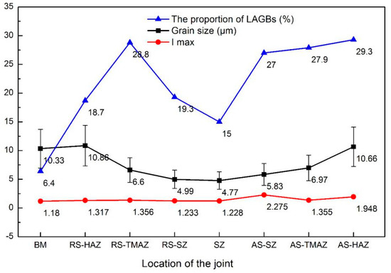 Figure 10 shows the microstructure at different locations in the horizontal direction of the joint. The average grain size of the HAZ was larger than that of the BM in both the advancing side (AS) and the retreating side (RS) owing to the influence of the thermal cycle. In the TMAZ, the material was affected by the thermal cycle as well as plastic deformation via the tool rotation. Thus, though dynamic recrystallization occurred in the TMAZ, it was incomplete because the heat and deformation were insufficient. Therefore, the average grain size of the TMAZ was smaller than that of the BM, and the average grain size of RS-TMAZ was slightly smaller than that of AS-TMAZ. The grain size of the SZ was fine and uniform owing to the complete dynamic recrystallization induced by severe deformation and high temperature. Further, the grain size of the AS-SZ was obviously larger than that of the RS-SZ, while the grain size distribution of RS-SZ was relatively uniform. The grain size of the AS was larger than that of the RS in both the SZ and the TMAZ, owing to the higher temperature at the AS than that at the RS [30]. In particular, the tool rotation direction in the AS is the same as the welding direction, making the relative friction rate between the AS material and the tool higher than that of RS. This induces more frictional heat in the AS, and higher temperatures promote grain growth. The proportion of LAGBs, the grain size and the Imax of the different zones in the joint are shown in Figure 11. From the RS-HAZ to the AS-HAZ, the average grain size and grain size deviation initially decreased and then increased. Compared with the other regions in the joint, the average grain size and grain size deviation of the SZ centre were the smallest owing to its complete dynamic recrystallization.