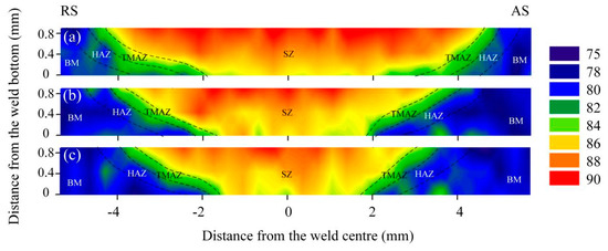Hardness maps of the welds produced at a welding speed of (a) 100, (b) 150, and (c) 200 mm/min.