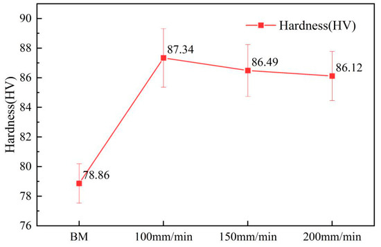 As shown in Figure 13, the average hardness of the joints at the welding speeds of 100, 150, and 200 mm/min were 87.34, 86.49 and 86.12 HV, respectively, which are all higher than that of the BM. It should be noted that hardness is affected by grain size in the present work. It is seen in Figure 6 and Figure 13 that, with the increase of welding speed, the grain gradually became coarser and the average hardness of the joints gradually decreased. The high hardness area of the joint decreased gradually with increasing welding speed, as shown in Figure 12. With constant rotation speed, the heat input decreased with increasing welding speed, which caused a decrease in the SZ area. Further, the hardness of the SZ was greater than that of the BM owing to refined grains. In addition, the hardness of the weld bottom decreased according to Figure 12 because the heat input was insufficient to promote dynamic recrystallization of the materials at the bottom of the plate. Actually, because of the extreme thinness of the plate, the heat can be easily spread to the bottom of the plate, but we note that the heat can be easily diffused owing to the minimal thickness.