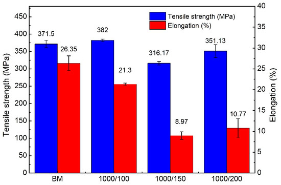 The mechanical properties of the joints and the BM are given in Figure 14. It can be seen that, with increasing welding speed, the tensile strength of the joints initially decreased and then increased. The elongation of the joints exhibited the same variational trend. The position of the fracture in the joint produced with a 100 mm/min welding speed was located in the BM. Generally speaking, the fracture of tensile samples occurs in the weakest sample position, signifying that the tensile strength of joint area was higher than that of the BM in this work. In addition, both the tensile strength and elongation of the 100 mm/min weld shown in Figure 14 were close to the properties of the BM. However, when the welding speed was increased to 150 and 200 mm/min, the fracture occurred in the centre of the SZ and the tensile strength reached 85% and 95% of the BM, respectively. The decrease of the tensile strength with increasing welding speed is primarily caused by remnants of the oxide layer in the weld [18]. Besel et al. [34] reported that, although the original oxide layer is removed prior to welding, a new oxide layer forms immediately under ambient lab conditions. When the welding speed is low (e.g., 100 mm/min), the tool has more rotations per unit distance, so the materials can be rotated completely and the oxide layer can be distributed uniformly. Furthermore, joints produced at the welding speed of 100 mm/min exhibited the smallest grain size and the highest proportion of HAGBs among all of the joints, as shown in Figure 6 and Figure 7, where finer grains and higher proportion of HAGBs are beneficial for increasing the tensile strength of the joint. It is noteworthy that the tensile strength of the joints produced with a 200 mm/min welding speed is higher than that produced with 150 mm/min, which is mainly owing to the decreased thickness reduction ratio of the joints with increasing welding speed. The thickness reduction ratio of the joints produced with a 150 mm/min welding speed was 3.56%, while that with 200 mm/min was 2.53%. Thus, both the oxide layer and thickness reduction play an important role in the mechanical properties of the FSW-processed ultra-thin Al–Mg alloys.