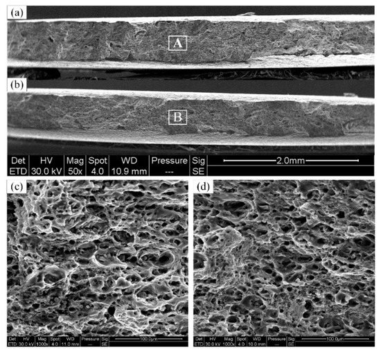SEM images of the fracture surfaces of the (a) BM, and (b) FSW joints with welding speed of 100 mm/min, (c) magnified image of area A in (a), and (d) magnified image of area B in (b).