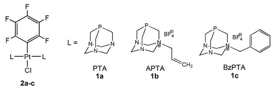In our attempt to contribute to the knowledge of phosphine trans-platinum compounds and their biological activity, we synthesized the PTA (1a) N-allyl and N-benzyl tetrafuoroborate derivatives 1-allyl-1-azonia-3,5-diaza-7-phosphaadamantane (APTA(BF4), 1b) and 1-benzyl-1-azonia-3,5-diaza-7-phosphaadamantane (BzPTA(BF4), 1c) and the water soluble Pt(II) hexafluorophenyl complexes trans-(PtCl(C6F5)(PTA)2) (2a), trans-(PtCl(C6F5)(APTA)2)(BF4)2 (2b) and trans-(PtCl(C6F5)(BzPTA)2)(BF4)2 (2c; Figure 1).
