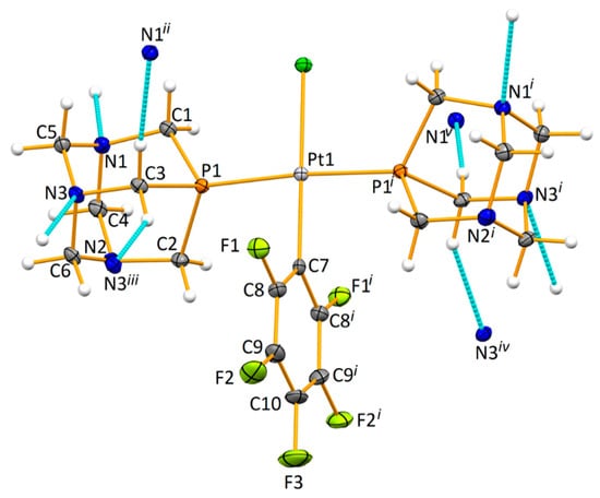 X-ray quality crystals of complex 2a (Figure 2) have been obtained by slow diffusion of diethyl ether on a dichloromethane solution of the compound in air and at room temperature. It crystalized in the monoclinic space group C2/c, its asymmetric unit including a PTA phosphine ligand and half of the fluorinated moiety. Resulting from the two-fold axis that runs across the molecule, a mononuclear compound is thus constructed from a Pt(II) cation, which is bound to a chloride anion, P-bound to two PTA phosphines and C-bound to one pentafluorobenzene anion, therefore giving rise to a square planar geometry (τ4 = 0.03) []. The pentafluorophenyl ring lies perpendicular to the plan constructed by the Pt-, P- and Cl-atoms (89.8°). The bond lengths involving the metal and the donor atoms (see Figure 1, legend), are within those found in other Pt(II) compounds [,,,,,]. No classical H-bond interactions could be found in 2a, but the shortest C–H⋅⋅⋅N interactions (Figure 1) expand the structure to the third dimension.