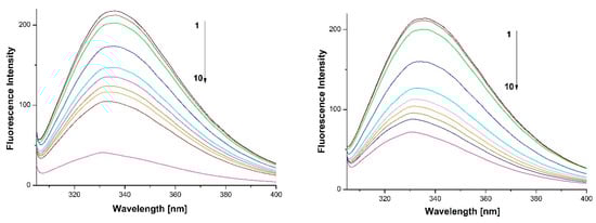 Fluorescence emission spectra of HSA-2b (left) and -2c (right) systems. Experimental conditions: (1) HSA (10 μM) and (2)–(10) HSA 10 μM with Pt complex at 5, 10, 30, 50, 60, 70, 80, 90 and 100 μM; pH = 7.40, 0.05 M phosphate buffer, incubation at 37 oC during 24 h, λex = 295 nm.