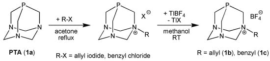 Synthesis of allyl (1b) and benzyl (1c) PTA derivatives.