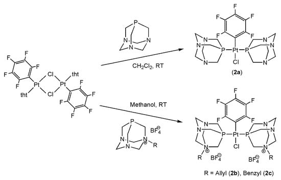 The platinum pentafluorophenyl complexes trans-(PtCl(C6F5)(PTA)2) (2a) and the bis-cationic trans-(PtCl(C6F5)(APTA)2)(BF4)2 (2b) and trans-(PtCl(C6F5)(BzPTA)2)(BF4)2 (2c) have been obtained as white powders with yields in the range 77–99% by reaction of 4 equivalents of 1a, 1b or 1c with the binuclear complex trans-(Pt(μ-Cl)(C6F5)(tht))2 (tht = tetrahydrothiophene; Scheme 2).