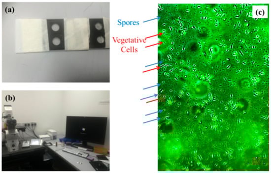 Procedure to calculate the spores and vegetative cells. (a) staining process by 4′,6-diamidino-2-phenylindole DAPI; (b) Z1-inverted microscopy; (c) identification of bacteria and spores based on the microscopy image.