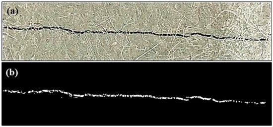 Figure 2a illustrates a raw image directly obtained by a camera device. It can be found that the color of the crack is dark. In this study, a raw, colorful image was transferred into a gray image first; thereafter, pre-processing work was conducted, which included contrast enhancement, removal of the noise points caused by the density mutant, and burr smoothing of the border. In the final step, the Otsu binary method was used to determine the optimal threshold [28], which can effectively distinguish the crack from the surrounding matrix. Consequently, a binary image of crack can be obtained, as shown in Figure 2b. By the use of morphological operation described above, cracks are effectively extracted from the surrounding matrix. Accordingly, geometry indicators, such as crack area, width, and length, are calculated based on the pixel number that the crack contains.