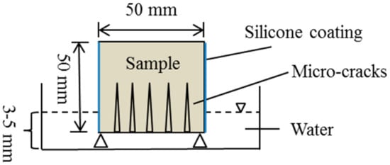 Before each test, the specimens were dried in an oven at 60 ± 5 °C for three days. The test set-up was illustrated in Figure 3. As shown in the figure, the immersion depth of the specimen is between 3 and 5 mm. Four vertical faces of the specimen were sealed by a silicone coating to ensure one-directional water-flow through the specimen. Rate of absorption (mm3/mm2), defined as the variation in mass (g) divided by cross-sectional area of the tested specimen (mm2) and density of water at the ambient temperature (g/mm3), was plotted against the square-root of time, as detailed in Hall [30]. The sorptivity of the specimen was defined as the slope of the above curve at the initial 6 h of testing. The development of sorptivity with the times of spraying could characterize the repair efficiency.