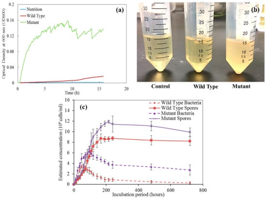 Figure 4 s the growth curves for the two bacteria strains. The mutant strain has a much higher growth rate in the 16-h after inoculation (see Figure 4a). The mutant strain looks milkier, compared to the wild type that is relatively transparent (see Figure 4b). For a relatively long incubation time (720 h), the mutant strain has more vegetative cells and spores, compared to the wild type under the same growth condition (see Figure 4c).