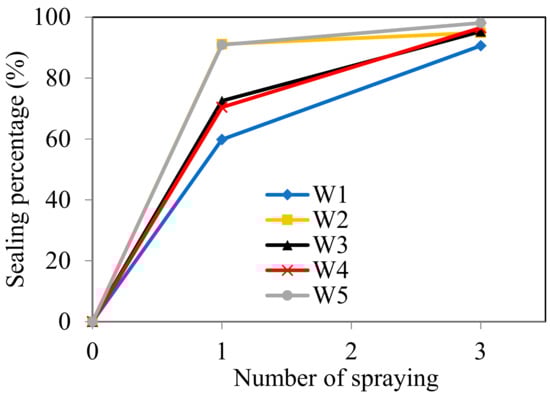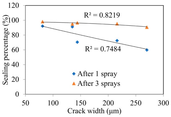Table 3 summarized the measured crack width, crack area before and after spraying, and the calculated sealing percentage by using the DIP technique. Figure 6 illustrated the development of sealing percentage with the number of spraying times. As expected, the crack sealing percentage increases with the number of spraying times. As listed in Table 3, even after only one spraying, the sealing percentage of the crack with 81 μm width reached 92.1%. For the crack with 270 μm width, the sealing percentage could also achieve 59.8%. After three sprayings, all the cracks were sealed almost completely as the sealing percentage of all reached above 90%. Moreover, the crack-sealing percentage presents a liner descending relation with the crack width. As plotted in Figure 7, the sealing percentage decreases as the crack width increases, especially after ones praying. That’s easily understood as a wider crack needs more MICP products to fill. However, after three sprayings, mutant bacteria generated enough MICP products that allowed it fill the crack space almost completely even when the crack width reached 270 μm, which is the largest in this study.